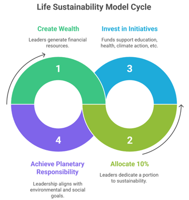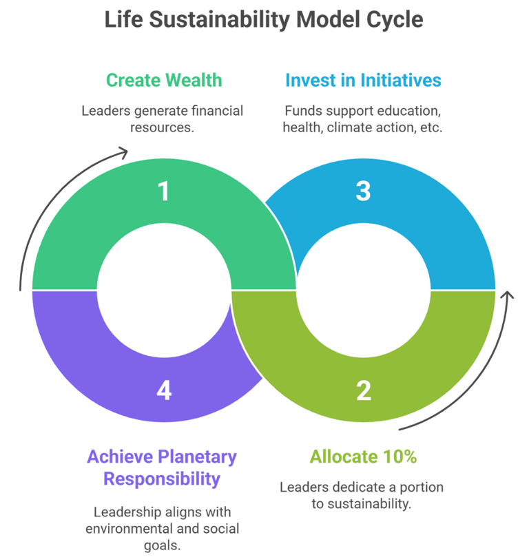 Every MLG participant follows the Life Sustainability Model, committing 10% of value created toward sustainable planet initiatives such as education, health, climate action, and social well-being—ensuring leadership success aligns with planetary responsibility.